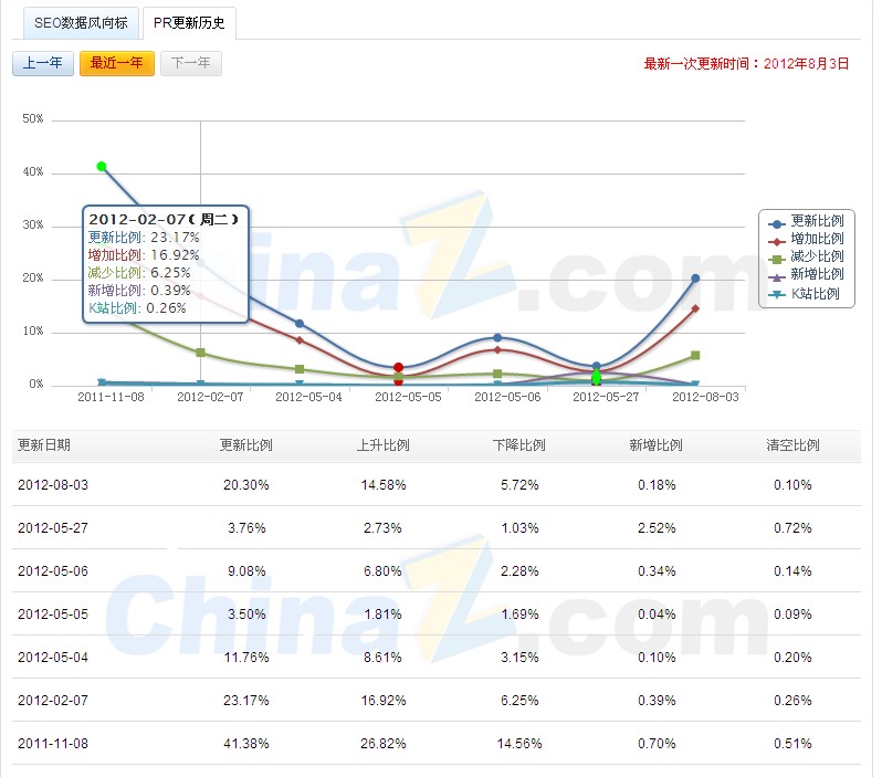 谷歌PR值一直以來都是我們判斷網(wǎng)站價值的一個非常重要的標(biāo)準(zhǔn),雖然有些人說谷歌PR可以刷,不一定準(zhǔn)確,但是這樣的標(biāo)準(zhǔn)太少了,難的有一個可以參考的,所以交換友情鏈接也好,買賣網(wǎng)站也好、代發(fā)文章也好,都要求PR達(dá)到一定的值。根據(jù)大量統(tǒng)計分析,谷歌PR如無意外將在11月初更新,以下圖來自站長之家的數(shù)據(jù)風(fēng)向標(biāo)。