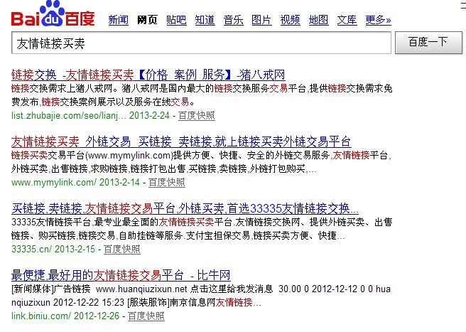 可能有人會(huì)問(wèn)了,百度為什么不用算法直接K掉這些站呢?這是因?yàn)橐粋€(gè)知名的網(wǎng)站,比如阿里微微,外鏈過(guò)萬(wàn),alexa排名一萬(wàn)名以內(nèi),知名度高,如果以算法來(lái)進(jìn)行處罰,會(huì)影響到很多優(yōu)質(zhì)的網(wǎng)站,所以只有進(jìn)行人工干預(yù),我這么說(shuō)不是沒(méi)有道理的,大家看下面這張圖,我在百度搜索“友情鏈接買賣”,大家可以看到,目前排在首頁(yè)的都是以前一些影響較小的鏈接交易站,但在這次的算法更新中并沒(méi)有被K,就說(shuō)明了百度確實(shí)施行了人工干預(yù)。