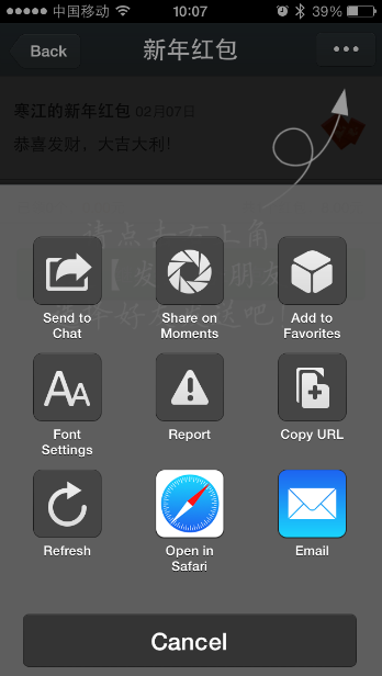 如果您有多個(gè)好友需要發(fā)送紅包,呵呵~~那您就得每次都要點(diǎn)個(gè)“發(fā)送紅包給好友”,趁著那個(gè)黑色的說明頁沒消失之前再點(diǎn)右上角的“…”,才能成功發(fā)送給好友,是不是挺麻煩?騰訊這個(gè)推廣做的真是夠坑爹的呀,要是不注意,發(fā)個(gè)推廣鏈接給客戶,豈不是要尷尬死了。